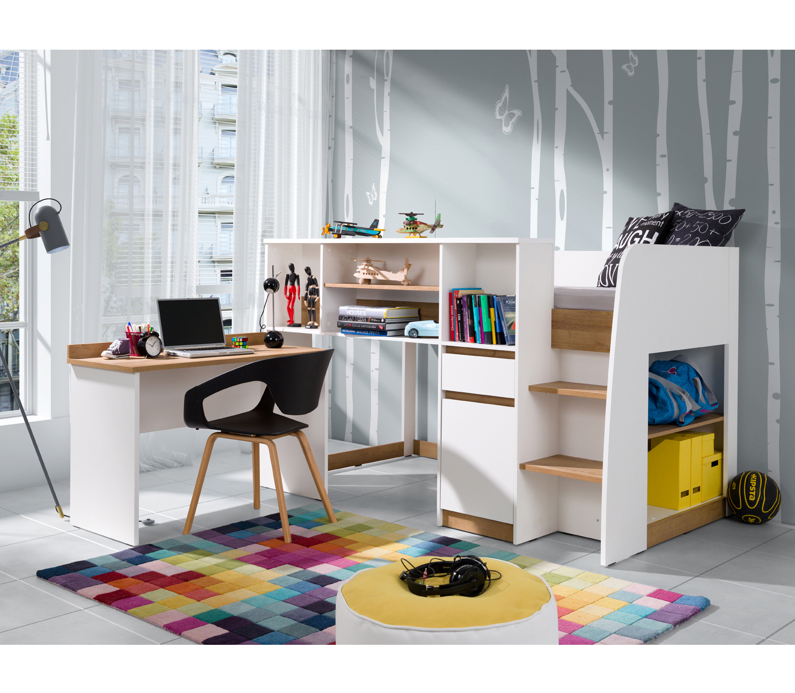 Wśród propozycji, które pozwalają zaoszczędzić znaczną ilość miejsca i jednocześnie optycznie powiększyć pokój, znajdują się łóżka piętrowe z biurkiem. Dzięki wstawieniu do niewielkiego pomieszczenia takiej konstrukcji, zarówno łóżko, jak i biurko zajmują w metrażu to samo miejsce.